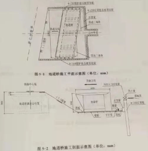 某公司承建一项城市主干路工程,长度2.4km,在桩号K1+180—K1+196 位置与铁路斜交,采用四跨地道桥顶进下穿铁路的方案,为保证铁路正常通行,施工前由铁路管理部门对铁路线进行加固,顶进工作坑顶进面采用放坡加网喷混凝土方式支护,其余三面采用钻孔灌注桩加桩间网喷支护,施工平面及剖面如图5-1、5-2 所示。