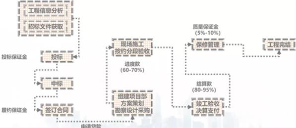 招标前承包商对工程信息进行分析,判断是否参与投标,然后购买标书,并详细准备投标文件;投标前缴纳投标保证金,中标后置换为履约保证金,同时签订工程合同;拿着工程合同就可以申请贷款,随后组建项目部并进行方案策划,勘察设计等工作进行采购分包,在此阶段前一般只能拿到10-30%的工程预付款;现场施工阶段按合约分段验收支付进度款,通常前期预付款会逐步扣回,到竣工验收阶段,企业一般能拿到总结算款项的80-95%;通常会留下结算款的5-10%作为质量保证金,在保修期后工程真正完结之时才可拿回。