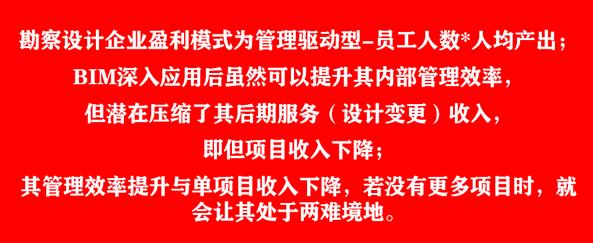 2、勘察设计企业是管理驱动型,当前盈利模式主要为员工数量*人均产出,决定了其在BIM应用过程中的两难选择;